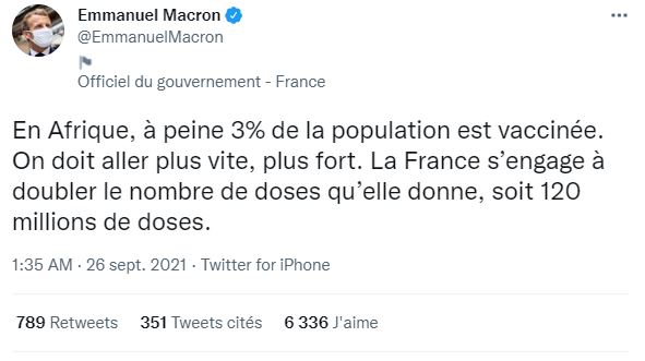 ”Στην Αφρική, μόλις το 3% του πληθυσμού εμβολιάζεται. Πρέπει να πάμε πιο γρήγορα, πιο δυνατά. Η Γαλλία δεσμεύεται να διπλασιάσει τον αριθμό των δόσεων που δίνει, σε 120 εκατομμύρια δόσεις.” Δήλωση Μακρόν που κινείται στην κατεύθυνση του υγειονομικού αποικιοκρατισμού μισιοναρισμού..Εκτός από Λιβύη, Σάχελ στην υποσαχάρεια Αφρική, Μαλί, αιματηρή διένεξη γαλλόφωνων κι αγγλόφωνων στο Κογκό και το βεβαρυμμένο παρελθόν στο Μαγκέμπ κλπ η ανάμειξη της Γαλλίας μιας από τις μεγαλύτερες αποικιοκρατικές δυνάμεις στην Αφρική δεν περιορίζεται μόνο στον έλεγχο καθεστώτων σε πραξικοπήματα σε αφαίμαξη πλουτοπαραγωγικών πηγών σε απευθείας επιθέσεις όπως στη Λιβύη σε στρατιωτικές βάσεις για γεωπολιτική της ανάπτυξη.