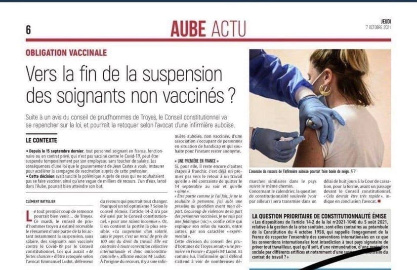 Μετά από γνωμοδότηση του Conseil de prud’hommes του de Troyes (δικαστήριο εργασίας ή δικαστήριο απασχόλησης/Δικαστήριο Εργατικών Διαφορών), το Συνταγματικό Συμβούλιο θα επανεξετάσει τον νόμο και θα μπορούσε να τον ανακαλέσει, σύμφωνα με τον δικηγόρο νοσηλευτή από το Aube. Aυτή την Τρίτη το Συμβούλιο pru-d’hommes de Troyes εκτίμησε αποδεκτή την επανεξέταση ενός μέρος του ισχύοντος νόμου κυρίως για την αναστολή άνευ μισθού ανεμβολίαστων υγειονομικών κατά covid19 από το Συνταγματικό Δικαστήριο ( που επέχει θέση ΣτΕ).Ο νόμος έχει σημαντικές πιθανότητες ν’ αναθεωρηθεί σύμφωνα με τον δικηγόρο Emmanuel Ludot συνήγορο της έφεσης και όλα μπορεί ν’ αλλάξουν.Σύμφωνα με το conceil remois το άρθρο 14-2 δεν δεσμεύθηκε από το Συνταγματικό Συμβούλιο για άγνωστο λόγο.” Η αναστολή εργασίας ενός μισθωτού χωρίς καταβολή μισθοδοσίας αποτελεί ένα πισωγύρισμα περίπου ενός αιώνα του Εργατικού Δικαίου.Είναι αντίθετη σε κάθε διεθνή συλλογική σύμβαση κι επομένως αντισυνταγματική” αποφαίνεται ο κ. Ludot.Στη ρίζα της έφεσης είναι μια ανεμβολίαστη νοσοκόμα μιας ένωσης που ασχολείται με άτομα με αναπηρία και που για την ώρα θέλει να παραμείνει στην ανωνυμία. Δεν εμβολιάστηκε γιατί όπως λέει το εμβόλιο είναι πειραματικό και καταγγέλει πως έγινε αποδέκτης αφόρητων πιέσεων και βίας εκ μέρους συναδέλφων της εμβολιασμένων πριν βγει στην αναστολή. Ο δικηγόρος της ισχυρίζεται πως η απόφαση είναι η α στη Γαλλία κι αναμένει στη συνέχεια να δει πολυάριθμες παρόμοιες υποθέσεις ακολουθώντας τον ίδιο δρόμο. Το χρονοδιάγραμμα αναφορικά με το θέμα της συνταγματικότητας που εγείρεται προβλέπει να μεταφερθεί εντός προθεσμίας 8 ημερών στο Ακυρωτικό Δικαστήριο πριν φθάσει στο Συνταγματικό Συμβούλιο. Κι αυτό ”οφείλει να είναι πολύ σύντομο” αναφέρει ο δικηγόρος της νοσοκόμας.