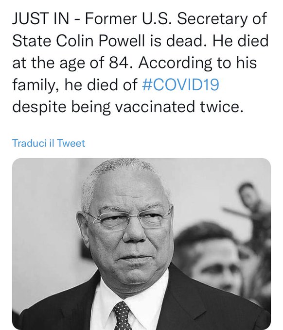 Ο τ. ΥΠΕΞ των ΗΠΑ ο Colin Powell πέθανε σε ηλικία 84 ετών. Σύμφωνα με την οικογένεια του πάθανε από covid19 παρ ότι ήταν διπλά δηλ. πλήρως εμβολιασμένος. Μερίδα του διεθνή τύπου την ίδια στιγμή γράφει ότι πέθανε από κρυολόγημα. O Κόλιν Πάουελ πάντως σύμφωνα με την οικογένειά του πέθανε από επιπλοκές της covid-19 αν και πλήρως εμβολιασμένος..