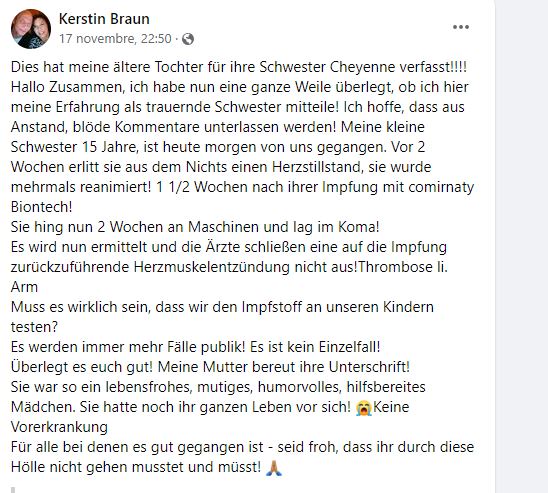 Ορισμένες καλοδιαβασμένες, κοινοποιημένες και σχολιασμένες αναρτήσεις στο Telegram και στο Facebook έχουν προκαλέσει πρόσφατα αίσθηση και μεγάλη έκπληξη. Η Kerstin Braun από το Hollfeld μπήκε χθες στο διαδίκτυο με αρκετές αναρτήσεις στο προφίλ της στο Facebook για τον ξαφνικό θάνατο της 15χρονης κόρης της και είναι αρκετά σίγουρη ότι φταίει ο εμβολιασμός με το εμβόλιο από την BioNTech / Pfizer.
