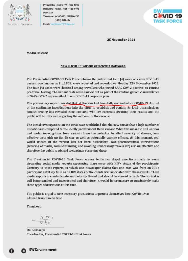 Σύμφωνα με όσα αποκαλύπτει ανακοινωθέν της Προεδρίας της Covid19 Taske Force της Δημοκρατίας της Μποτσουάνα-Botswana: ”τα 4 κρούσματα μιας νέας παραλλαγής Covid19 γνωστής ως B.1.1.529 αναφέρθηκαν και καταγράφηκαν τη Δευτέρα 22 Νοέμβρη 2021.Τα 4 κρούσματα ανιχνεύθηκαν μεταξύ ταξιδιωτών που υποβλήθηκαν σε τεστ κι αποδείχθηκαν θετικοί στον SARS-COV-2 σε test ρουτίνας που πραγματοποιήθηκε πριν από το ταξίδι...Η προκαταρκτική αναφορά αποκάλυψη ότι και οι 4 ήταν πλήρως εμβολιασμένοι για Covid19.” (σσ Φανταστείτε να ήταν πλήρως ανεμβολίαστοι τι θα είχε συμβεί πόσο θα είχε επιταχυνθεί κι ενταθεί ο στιγματισμός το πογκρόμ και η γκετοποίηση σε όλα τα επίπεδα των ανεμβολίαστων. Γι αυτό Μποτσουάνα αγάπη μου )