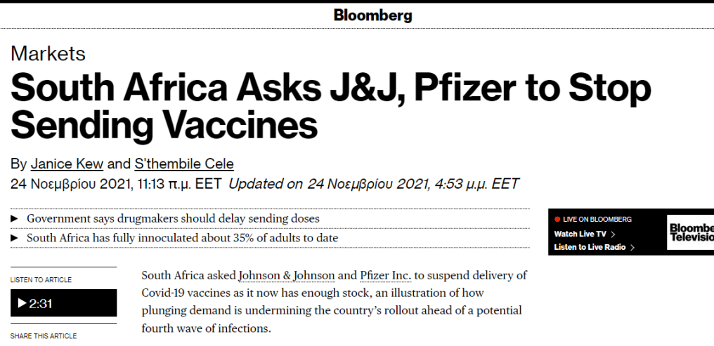 Στις 24 Νοεμβρίου το Bloomberg αποκάλυπτε ότι η χώρα που μπήκε στο μάτι του κυκλώνα και στοχοποιήθηκε για τη νέα παραλλαγή την Όμικρον η Νότια Αφρική είχε ζητήσει από J&J και Pfizer να σταματήσουν την αποστολή παράδοση εμβολίων. Ασυσχέτιστο;; Η επίσημη δικαιολογία ήταν ότι έχει αρκετό στοκ ένας υπαινιγμός στην πτώση της ζήτησης.. Mέχρι εκείνη τη στιγμή είχαν εμβολιαστεί πλήρως το 35% των ενηλίκων σ’ ένα διάστημα άνω των 6 μηνών από τότε που διατέθηκαν στο κοινό για πρώτη φορά τα εμβόλια. Περίπου 120.000 άτομα εμβολιάστηκαν την Τρίτη ήτοι λιγότερο από το μισό του αριθμού των καθημερινών εμβολιασμών.