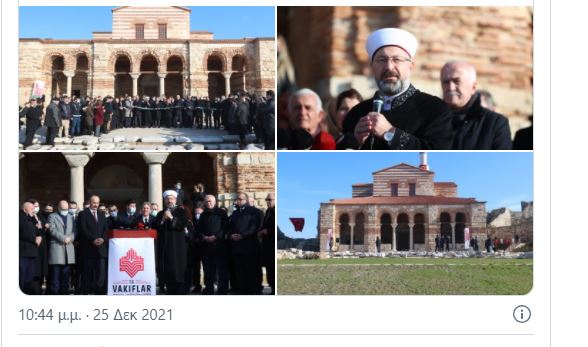 Είχε προηγηθεί η ανακοίνωση από τις θρησκευτικές αρχές της γείτονος για την Enez Ayasofya Cami-i Şerifi όπως την αποκαλούν που επανήλθε σε τζαμί μετά από 56 χρόνια κι επιχαίρουν. Η επίθεση σε πολιτισμικά μνημεία και ιστορική μνήμη συνεχίζεται είναι διαρκής υπό την ανοχή διεθνούς κοινότητας και οργανισμών της ΕΕ και λοιπών όμορων δυνάμεων. Ο ναός είναι στην Ανδριανούπολη.