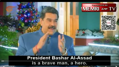 Ο αντισιωνιστής (σσ δεν είναι τυχαίο που δέχθηκε παγκόσμιο πόλεμο) πρόεδρος της Βενεζουέλας Μαδούρο παιδί της θεολογίας της απελευθέρωσης χριστιανός και αριστερός άξιος διάδοχος του στρατιωτικού και Προέδρου σύμβολο της Λατινικής Αμερικής Τσάβες μεγάλου υπέρμαχου του χριστιανικού κοινωνισμού μίλησε για τη Συρία για την τρομοκρατία για τον Άσαντ για το Ιράν για τον Qasem Soleimani στο λιβανέζικο κανάλι al mayadeen ( μετ. ΜΕΜRI):