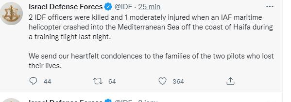 Ωρα 1.35 π.μ της 4/1/21 η τηλεόραση η ισραηλινή kann αναφέρει: εξουσιοδοτημένη πληροφορία: 2 πιλότοι της Tsahal σκοτώθηκαν σε ατύχημα στρατιωτικού ελικοπτέρου ont στ’ ανοιχά της Haïfa. Είναι επίσημο