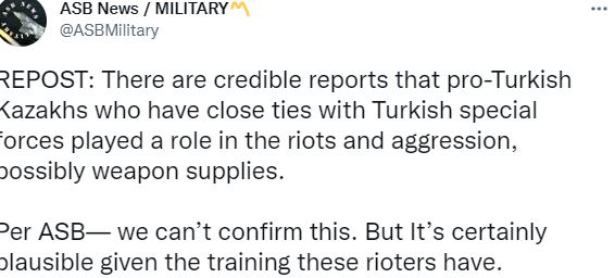 Υπάρχουν αξιόπιστες αναφορές ότι φιλότουρκοι Καζακστανοί με στενούς δεσμούς με τουρκικές ειδικές δυνάμεις έπαιξαν ρόλο στις ταραχές και την επιθετικότητα, πιθανώς στην προμήθεια όπλων.