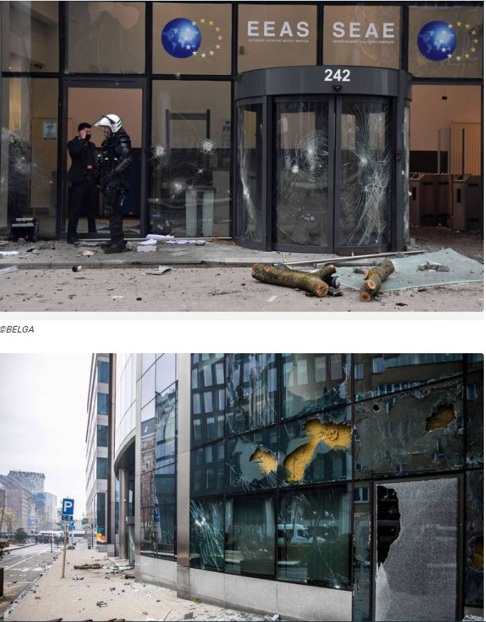 Εισβολή διαδηλωτών στην έδρα της Ευρωπαϊκής Υπηρεσίας για εξωτερική δράση (SEAE) με καδρόνια πέτρες μπογιές οι αστυνομικοί υπεραμύνονταν από το εσωτερικό..