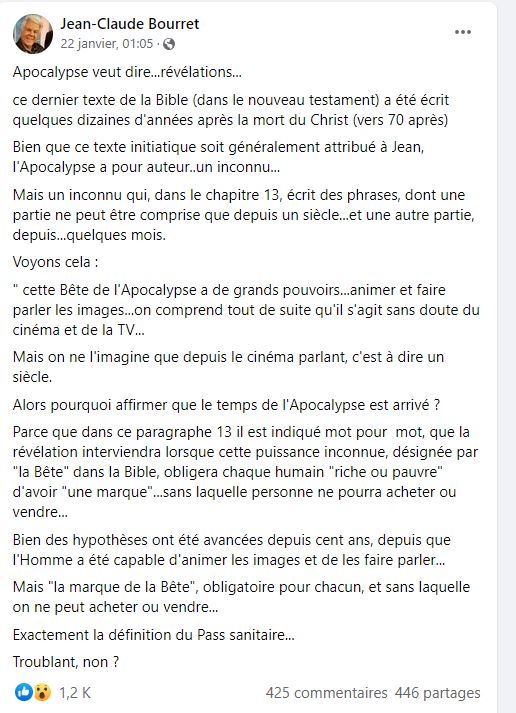 Η περίοδος της Κοβιντοκρατίας μας φέρνει πιο κοντά στην Αποκάλυψη; Όταν πλέον των Αγίων το διαπιστώνουν ως και κοινοί θνητοί κάτι σημαίνει. Θήτευσε σε μεγάλα ΜΜΕ. Ο Jean-Claude Bourret διετέλεσε αρχισυντάκτης σε France-Inter/ FR3 /TF1 / La Cinq / RMC κλπ Σε μια τελευταία του ανάρτηση παρατηρεί: