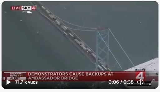 Τα καμιόνια μπλοκάρουν την γέφυρα Ambassador Bridge που συνδέει τον Καναδά (Windsor) και τις ΗΠΑ (Détroit). Η μεγαλειώδης γέφυρα είναι το πιο πολυσύσχναστο διεθνές πέρασμα της Βόρειας Αμερικής. Πάνω από το 25 % του εμπορίου μεταξύ ΗΠΑ-Καναδά περνάει από αυτό το συνοριοπέρασμα. Eντυπωσιακές σκηνές. Στο μεταξύ η Οτάβα κηρύχθηκε σε κατάσταση Έκτακτης Ανάγκης λόγω των κινητοποιήσεων των φορτηγατζήδων.