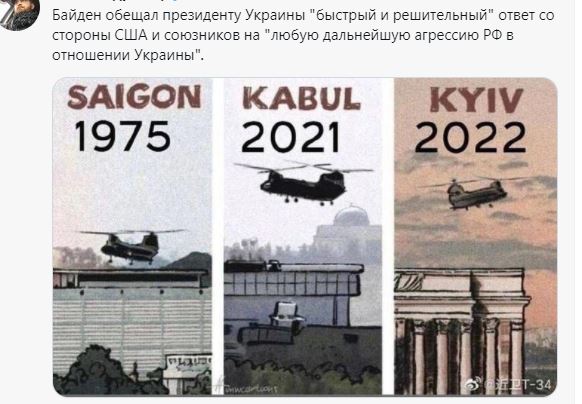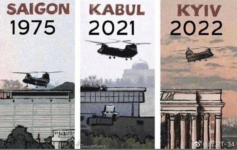 Μεγάλη διπλωματική και μιντιακή κινητικότητα στο ουκρανικό εδώ και μέρες που κορυφώνεται σιγά σιγά. Αρχίζουν ν΄ανοίγουν όλα τα χαρτιά. Από όλες τις δημοσιεύσεις δηλώσεις επαφές κλπ θεωρώ πολύ σημαντικό ότι Ρώσοι πολεμικοί ανταποκριτές που ήταν σφίγγα ως τώρα κι επαναλάμβαναν στερεότυπα το αφήγημα που επιβάλει η κρισιμότητα των στιγμών έκαναν σήμερα αναρτήσεις που διαφωτίζουν την υπόθεση και ξεκαθαρίζουν σε κάποιο βαθμό ότι όντως επίκειται άτακτη υποχώρηση δυτικών από Ουκρανία. Το πως θα επέλθει δεν είναι πλήρως διασαφηνισμένο. Στις αναρτήσεις τους σε προσωπικούς λογαριασμούς στα social media εμφανίζουν με φωτομοντάζ τον Ζελένσκι και τους συν αυτών να εγκαταλείπουν άρον άρον το Κίεβο όπως οι εντολοδόχοι των ΗΠΑ στο Αφγανιστάν. Ενώ σε άλλες αναρτήσεις υπενθυμίζουν τη φυγή των Αμερικανών από αέρος σε Σαϊγκόν (παραπομπή στο 1975 που Νοτιοβιετναμέζοι πολίτες σκαρφαλώνουν στον τοίχο της πρεσβείας των ΗΠΑ στη Σαϊγκόν με στόχο να φύγουν με τα ελικόπτερα) , Αφγανιστάν και τώρα Ουκρανία..Προειδοποιούν πως η Ουκρανία θα γίνει νέο Βιετνάμ για ΗΠΑ.
