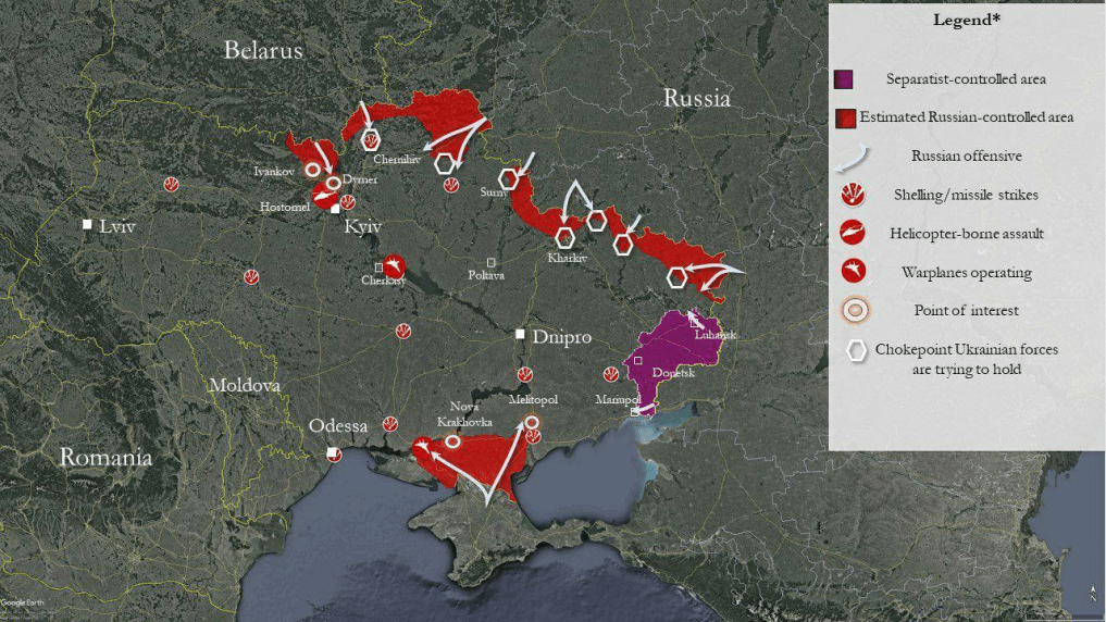 Η Ρωσία πιθανότατα θα συνεχίσει τις επιθέσεις της από βορειοδυτικά και νοτιοδυτικά του Κιέβου – με στόχο να το περικυκλώσει. Οι Ρώσοι εφορμούν με βαριά τεθωρακισμένα και πυροβολικό για να υποστηρίξουν την πολιορκία. Οι πολιτοφυλακές στο Κίεβο αμύνονται με AD, NLAW, MANDPADS αλλά και επενδύουν για κάλυψη στο αστικό περιβάλλον.