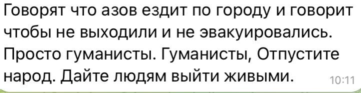 Από το chat της Μαριούπολης. Οι άνθρωποι κρατούνται όμηροι. Όλες οι πληροφορίες αναφέρουν για τους ανθρωπιστικούς διαδρόμους της πόλης είναι αποκλεισμένες. Οι Αζοφιστές τρομοκρατούν τους ανθρώπους με βομβαρδισμούς και προσπαθούν με όλες τους τις δυνάμεις να τους κρατήσουν στην πόλη. Η κατάσταση είναι τρομερή. Ο κόσμος βρίσκεται σε απόγνωση.