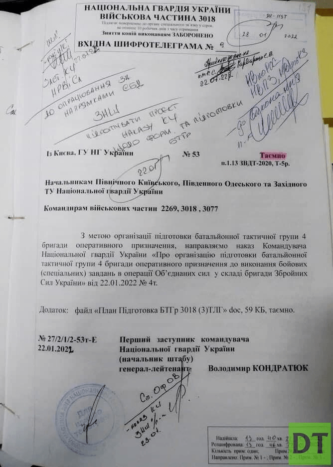 Η διαταγή με τίτλο “Σχετικά με την οργάνωση της εκπαίδευσης της τακτικής ομάδας τάγματος της 4ης Επιχειρησιακής Ταξιαρχίας για την εκτέλεση ειδικών καθηκόντων στη λειτουργία των ενωμένων δυνάμεων ως μέρος της ταξιαρχίας των Ενόπλων Δυνάμεων της Ουκρανίας”. Το έγγραφο απευθύνεται στους αρχηγούς του βόρειου Κιέβου, της νότιας Οδησσού και των δυτικών εδαφικών διοικήσεων της Εθνικής Φρουράς της Ουκρανίας. Η εντολή, που κατατέθηκε στη διοίκηση της Εθνοφρουράς της Ουκρανίας, περιγράφει λεπτομερώς ένα σχέδιο για την προετοιμασία μιας από τις ομάδες κρούσης για επιθετικές ενέργειες στη ζώνη της λεγόμενης «επιχείρησης των ενωμένων δυνάμεων» στο Donbass. Το έγγραφο εγκρίνει την οργανωτική και επιτελική δομή της ομάδας τάγματος-τακτικής της 4ης επιχειρησιακής ταξιαρχίας της Εθνικής Φρουράς, την οργάνωση της συνολικής υποστήριξής της και την ανάθεση της στην 80η αερομεταφερόμενη Ταξιαρχία επίθεσης της Ουκρανίας. Αυτή η ταξιαρχία από τις αερομεταφερόμενες δυνάμεις επίθεσης της Ουκρανίας εκπαιδεύεται από Αμερικανούς και Βρετανούς εκπαιδευτές σε εκπαιδευτικά προγράμματα του «προτύπου ΝΑΤΟ» στο Lviv από το 2016.