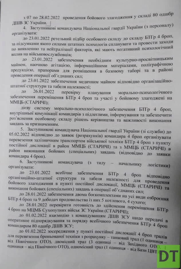 Σύμφωνα με τη διαταγή, ο Αναπληρωτής Διοικητής της Εθνικής Φρουράς αναλαμβάνει να οργανώσει τον συντονισμό μάχης της τακτικής ομάδας τάγματος της Εθνικής Φρουράς ως μέρος της 80ης χωριστής αερομεταφερόμενης ταξιαρχίας επίθεσης των Ενόπλων Δυνάμεων της Ουκρανίας από τις 7 Φεβρουαρίου έως τις 28 Φεβρουαρίου 2022. Πέντε παράγραφοι της ενότητας 4 είναι αφιερωμένες στο θέμα της προσεκτικής επιλογής προσωπικού, της εξέτασης όλων των ψυχολογικών παραγόντων τους και της διασφάλισης των ισχυρών κινήτρων τους. Η Εθνική Φρουρά διατάσσεται να παρέχει «οπτική παρακολούθηση, πληροφοριακό και προπαγανδιστικό υλικό, σημαίες και τυπωμένα σήματα και σύμβολα ». Ο αναπληρωτής διοικητής της Εθνικής Φρουράς για το Προσωπικό διατάσσεται να οργανώσει “ένα αποτελεσματικό σύστημα πληροφόρησης, ηθικής και ψυχολογικής υποστήριξης για την ομάδα τάγματος-τακτικής της 4ης ταξιαρχίας επιχειρησιακού σκοπού, εσωτερικής επικοινωνίας των διοικητών με τους υφισταμένους”. Ταυτόχρονα, είναι σημαντικό να παρέχεται «εξήγηση στο προσωπικό για τις αποφάσεις της διοίκησης και τη σημασία της εκτέλεσης των μελλοντικών καθηκόντων». Η παράγραφος 12 της διαταγής απαγορεύει την αποστολή στην περιοχή συντονισμού μάχης και στον τόπο εκτέλεσης «ειδικών καθηκόντων μάχης» των εθνοφρουρών που έδειξαν «μη ικανοποιητικά» αποτελέσματα ψυχολογικών εξετάσεων σύμφωνα με το κριτήριο της «ετοιμότητας για κίνδυνο».