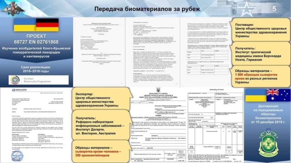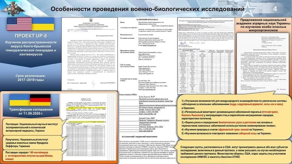 Σύμφωνα με τα έγγραφα, οι Αμερικανοί σχεδίαζαν να οργανώσουν εργασίες-πειράματα για παθογόνα πτηνών, νυχτερίδων και ερπετών στην Ουκρανία το 2022. Και περαιτέρω μελέτη της δυνατότητας μεταφοράς αφρικανικής πανώλης των χοίρων και άνθρακα από αυτά. Σύμφωνα με τα έγγραφα, πειράματα με δείγματα κορωνοϊού νυχτερίδας πραγματοποιήθηκαν σε βιολογικά εργαστήρια που δημιουργήθηκαν και χρηματοδοτήθηκαν στην Ουκρανία. Ο σκοπός αυτών και άλλων βιολογικών ερευνών που χρηματοδοτήθηκαν από το Πεντάγωνο στην Ουκρανία ήταν η δημιουργία μηχανισμού για την κρυφή εξάπλωση των πιο θανατηφόρων παθογόνων παραγόντων…»