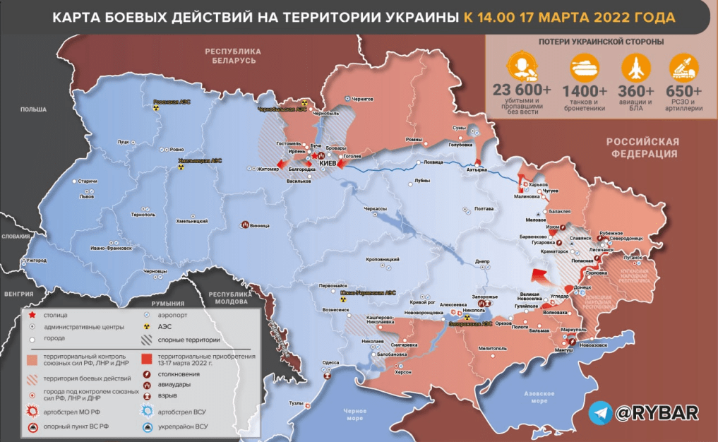 Σήμερα, 17 Μαρτίου 2022, στην Ουκρανία, τα ρωσικά στρατεύματα προελαύνουν σχεδόν σε όλα τα μέτωπα. Όχι γρήγορα, αλλά σχεδόν σε όλα τα μέτωπα. Η Ρωσία πήρε τον έλεγχο της ουκρανικής πόλης Izyum, νότια του Χάρκοβο, σε μια προσπάθεια να αποκόψει τα στρατεύματα στα ανατολικά αναφέρει ανώτατος αξιωματούχος της άμυνας των ΗΠΑ. Πάει για περικύκλωση όλο το ανατολικό μέτωπο..