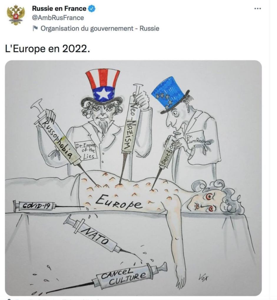 Μια ενδιαφέρουσα καρικατούρα δείχνει τις Ηνωμένες Πολιτείες ως ”Dr της αυτοκρατορίας των ψεμάτων” και την ΕΕ ως ”Dr EuroReich” να κάνουν ενέσεις, με γιγάντιες σύριγγες Covid19, ΝΑΤΟ, “ρωσοφοβία” , ”cancel culture” ,”νεοναζισμό”, ”κυρώσεις ”σ’ ένα σώμα γεμάτο πληγές κι εξανθήματα από τα τρυπήματα που είναι η Ευρώπη. Η λεζάντα γράφει ” η Ευρώπη το 2022..”Είναι μια αλληγορία της άρρωστης Ευρώπης, ξαπλωμένης σε ένα κρεβάτι, στην οποία οι βασανιστές της, οι Ηνωμένες Πολιτείες και η Ευρωπαϊκή Ένωση, εγχέουν διάφορες ουσίες με ενέσεις που παραπέμπουν σε εμβόλια με ενδείξεις «νεοναζισμός, «ρωσοφοβία» «Covid-19» κλπ.