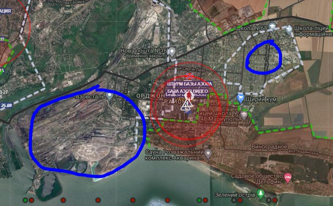Μια βάση του Αζόφ στη Μαριούπολη καταστράφηκε και οι εναπομείνασες δυνάμεις του Αζόφ έχουν ουσιαστικά κόπηκαν στα δυο. Σύμφωνα με αναφορές στο έδαφος, αφήνουν πίσω τους ολόκληρες συνοικίες για να αποσυρθούν στο εργοστάσιο Azovstal.