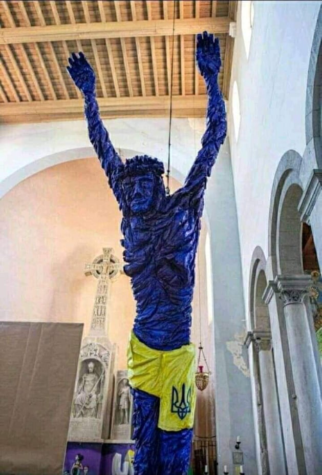 Σ’ εκκλησία στο Μόναχο της Γερμανίας ένα άγαλμα που παραπέμπει σε χιμπατζοειδές και παριστάνει τον Χριστό ντύθηκε στα χρώματα και τα σύμβολα της Ουκρανίας. Το απόλυτο κιτς.. Διαστρέβλωση του Χριστού και της ιστορίας μόνο τη σβάστικα δεν του έβαλαν…. To πολιτισμικό επίπεδο της Δύσης στα βάραθρα η πνευματικότητά της στο μηδέν. Ο Χριστός αν έχει τέτοιους φίλους τι τους θέλει τους εχθρούς…