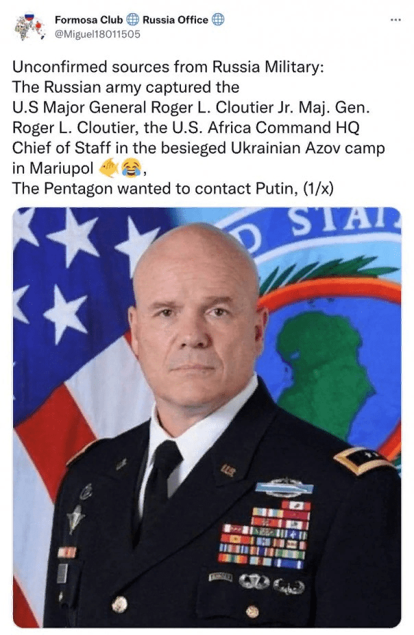 Από τις 2 Απρίλη εμφανίζονταν φήμες σε κινέζικα φόρουμ ότι ένα αμερικανικό «μεγάλο ψάρι», ο Αμερικανός υποστράτηγος Roger L. Cloutier Jr, Διοικητής της Συμμαχικής Χερσαίας Διοίκησης NATO, κρύβεται στην πολιορκημένη πόλη Μαριούπολη ακριβώς κάτω από τα μάτια του ρωσικού στρατού. Εάν επιβεβαιωθούν οι πληροφορίες, θα είναι αδιάψευστη απόδειξη της εμπλοκής του ΝΑΤΟ στη ρωσο-ουκρανική σύγκρουση.