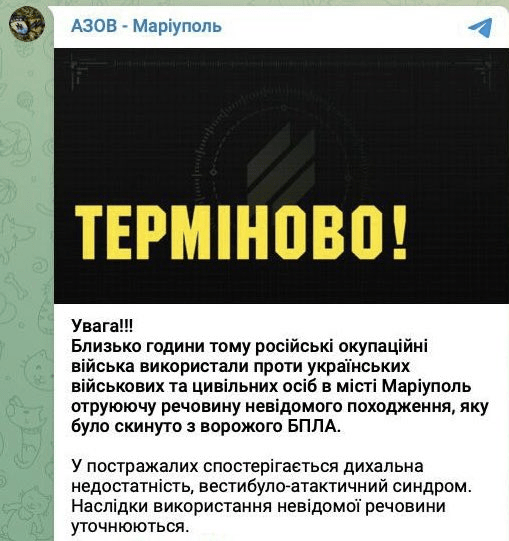 Το ναζιστικό τάγμα Azov ανέφερε ότι ο ρωσικός στρατός φέρεται να χρησιμοποίησε χημικό δηλητήριο από drone εναντίον τους στη Μαριούπολη.