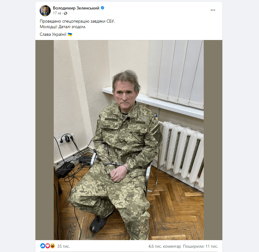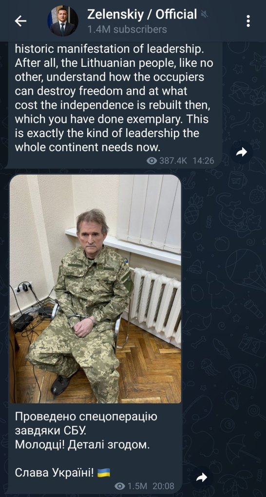 Ο Ζελένσκι ανακοίνωσε την κράτηση του Βίκτορ Μεντβεντσούκ πολιτικού αντιπάλου του και προσωπικού φίλου του Πούτιν δημοσιεύοντας μια φωτογραφία κάποιου που του μοιάζει στο κανάλι του στο Telegram. Ο αντιπολιτευόμενος πολιτικός, Βίκτορ Μεντβεντσούκ, παραμένει υπό κράτηση στα μπουντρούμια της SBU (Ουκρανική Ασφάλεια) του Zelensky.