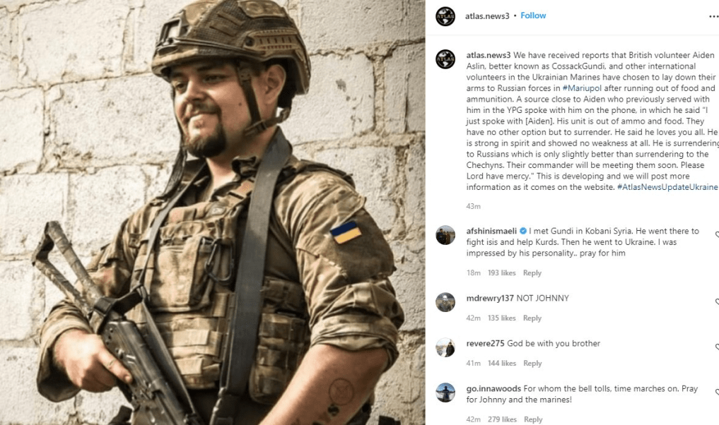 Ο Ayden Aislin, με το παρατσούκλι “Kazakgundi”, ζήτησε κάποιες ημέρες στο Twitter για να τον συλλάβουν οι Ρώσοι, αλλά δεν μπορούσε να παραδοθεί ,γιατί παρενέβησαν Ουκρανοί εθνικιστές. Στο παρελθόν έλεγε ότι θα κόψει κεφάλια Ρώσων και να βομβαρδιστεί το Rostov αλλά τώρα θέλει να αιχμαλωτιστεί γρήγορα γιατί φοβάται για τη ζωή του..