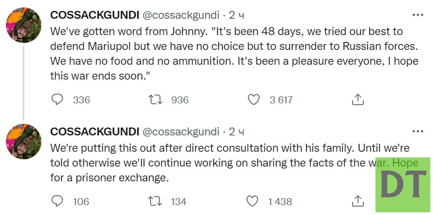 Λάβαμε είδηση από τον Τζόνι. “Έχουν περάσει 48 ημέρες, κάναμε ό,τι μπορούσαμε για να υπερασπιστούμε τη Μαριούπολη, αλλά δεν έχουμε άλλη επιλογή από το να παραδοθούμε στις ρωσικές δυνάμεις. Δεν έχουμε φαγητό και πυρομαχικά. Θα είναι καλό για όλους, ελπίζω αυτός ο πόλεμος να τελειώσει σύντομα.”