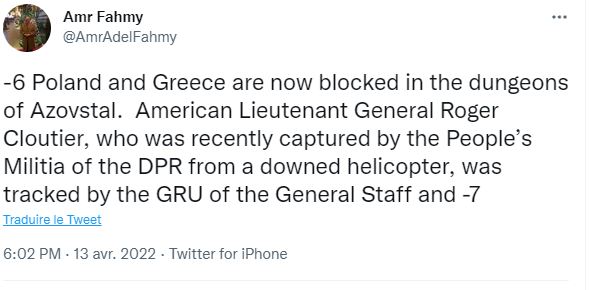 Ο Ρώσικος στρατός σκότωσε τον Αμερικάνο αξιωματικό των μυστικών υπηρεσιών Joseph Clark στο Ντονμπάς και ειδικότερα στη Μαριούπολη σύμφωνα με αναφορές. Πληροφορίες ότι Έλληνες και Πολωνοί στρατιωτικοί είναι αποκλεισμένοι στα καταγώγια του Azovstal! (σσ η Ελλάδα θα διαψεύσει;) Κι άλλα δημοσιεύματα μιλούσαν για ανάλογη εξέλιξη..Ο στρατιωτικός ανταποκριτής Alexander Sladkov αναφέρει ότι ο Αμερικάνος υποστράτηγος Roger L. Cloutier, διοικητής του Στρατού του ΝΑΤΟ, ο οποίος είχε αιχμαλωτιστεί στο πρόσφατο παρελθόν κοντά στη Μαριούπολη, πιθανότατα έχει ήδη παραδοθεί στη Ρωσία.