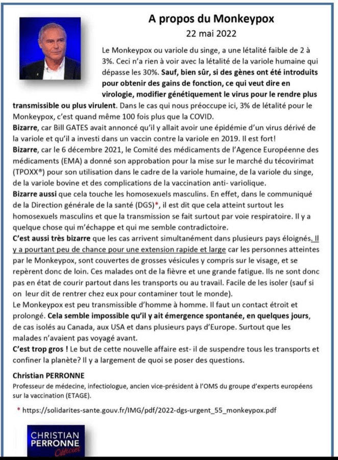 Εδώ είναι η επεξεργαμένη αντίδραση του Γάλλου καθηγητή Ιατρικής Christian Perronne. Λοιμωξιολόγου και τ. Αντιπροέδρου στον Π.Ο.Υ της ομάδας Ευρωπαίων ειδημόνων επί εμβολιασμού (ETAGE) στις (20/5/22) στην ανακοίνωση της ευλογιάς των πιθήκων.