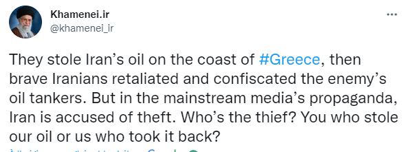 Αναφέρει: ”Έκλεψαν το πετρέλαιο του Ιράν στην ακτή της Ελλάδας, στη συνέχεια γενναίοι Ιρανοί ανταπέδωσαν και κατάσχεσαν τα πετρελαιοφόρα του εχθρού. Αλλά στην προπαγάνδα των mainstream media, το Ιράν κατηγορείται για κλοπή. Ποιος είναι ο κλέφτης; Εσύ που μας έκλεψες το πετρέλαιο ή εμείς που το πήραμε πίσω;”