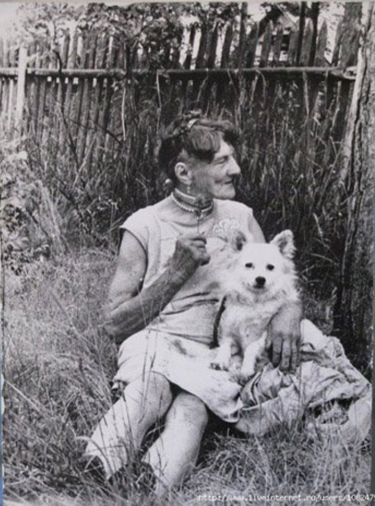 Για μια εβδομάδα σκεφτόμουν τα λόγια του Στάρετς και μέσα μου επαναλάμβανα: «Κύριε, βοήθησέ με να δω τη μητέρα Ναταλία». Έτσι, βγαίνοντας μια μέρα από το μοναστήρι, είδα, καθισμένη στο έδαφος, μια ηλικιωμένη κυρία ντυμένη περίεργα. Κουνιόταν μπρος πίσω σχεδόν στερεοτυπικά, με τα χέρια της να τυλίγονται γύρω από τα γόνατά της και επαναλάμβανε απαλά: Κάτια, Κάτια, σε περίμενα μια ολόκληρη εβδομάδα. Ένα καλάθι ήταν δίπλα της. Μέσα ήταν μια γάτα και μια κότα. Δεν υπήρχε τίποτα άλλο κοντά της. Θυμάμαι ότι αυτή η αμεσότητα με εξέπληξε.