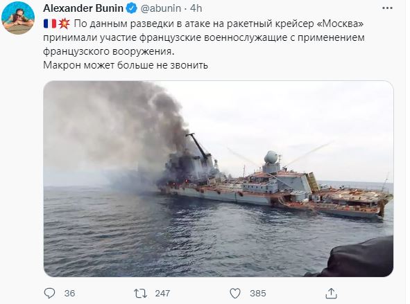 Ανεπιβεβαίωτες φήμες αναφέρουν ότι ”σύμφωνα με πληροφορίες, η επίθεση στο πυραυλικό καταδρομικό “Moskva” έγινε από Γάλλους στρατιώτες χρησιμοποιώντας γαλλικά όπλα.”