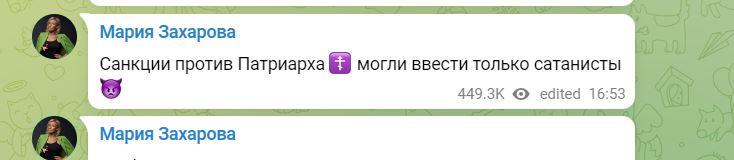 Στις 8 Ιουλίου οι αρχές του Καναδά επέβαλαν κυρώσεις κατά του αρχηγού της Ρωσικής Ορθόδοξης Εκκλησίας, κορυφαίων δημοσιογράφων της χώρας, αξιωματούχων, επιχειρηματιών και ρωσικού χρυσού. ”Κυρώσεις κατά του Πατριάρχη θα μπορούσαν να επιβληθούν μόνο από σατανιστές” απαντάει η Ζαχάροβα. Κάτι ξέρει…Υπονοεί κάτι είναι σαφές..Kαι δεν είναι καμιά θεούσα η Ζαχάροβα ούτε καμιά πλανεμένη σκοταδίστρια το αντίθετο κι ωστόσο φωτογραφίζει την ελίτ της Δύσης για Σατανισμό…Eίναι από τα γενοφάσκια της μέσα στη διπλωματία καθώς είναι κόρη υψηλόβαθμου Ρώσου διπλωμάτη.. Πολλά έχουν δει τα μάτια της και πολλές πληροφορίες διαχειρίστηκε…