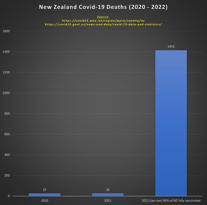 Στη Νέα Ζηλανδία όπου ο πληθυσμός είναι κατά 96% πλήρως εμβολιασμένος ο αριθμός των νεκρών από covid19 πέρασε από τους 25 και 26 το 2020-2021 στους 1415 κατά τη διάρκεια του πρώτου εξαμήνου του 2022.