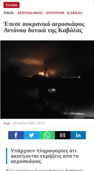 ”Ουκρανικό μεταγωγικό αεροσκάφος Antonov της Antonov Airlines συνετρίβη στη βόρεια Ελλάδα. Το αεροσκάφος θα μπορούσε να περιέχει όπλα που προμήθευε η Δύση για τις Ένοπλες Δυνάμεις της Ουκρανίας. Στο πλοίο επέβαιναν 8 μέλη του πληρώματος.