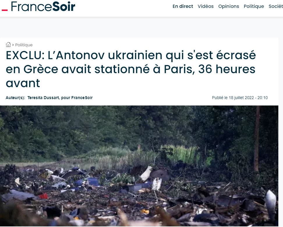 ”Αποκλειστικό: Το ουκρανικό Αντόνοφ που συνετρίβη στην Ελλάδα είχε σταθμεύσει στο Παρίσι, 36 ώρες πριν” επιγράφεται το άρθρο της γαλλικής francesoir. Ένα Antonov συνετρίβη το απόγευμα του Σαββάτου 16 Ιουλίου στη βόρεια Ελλάδα.