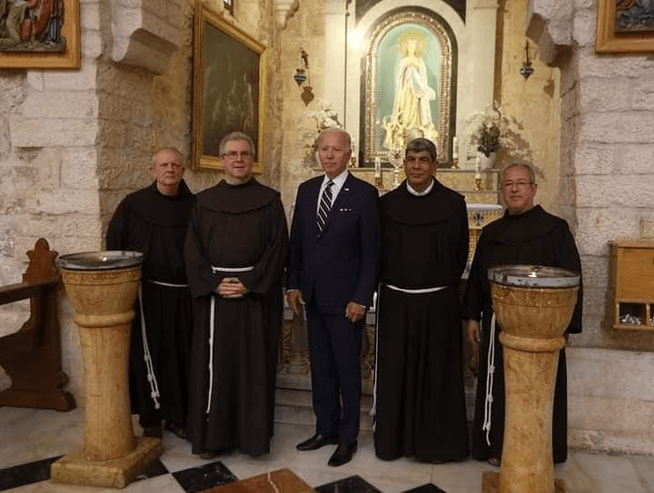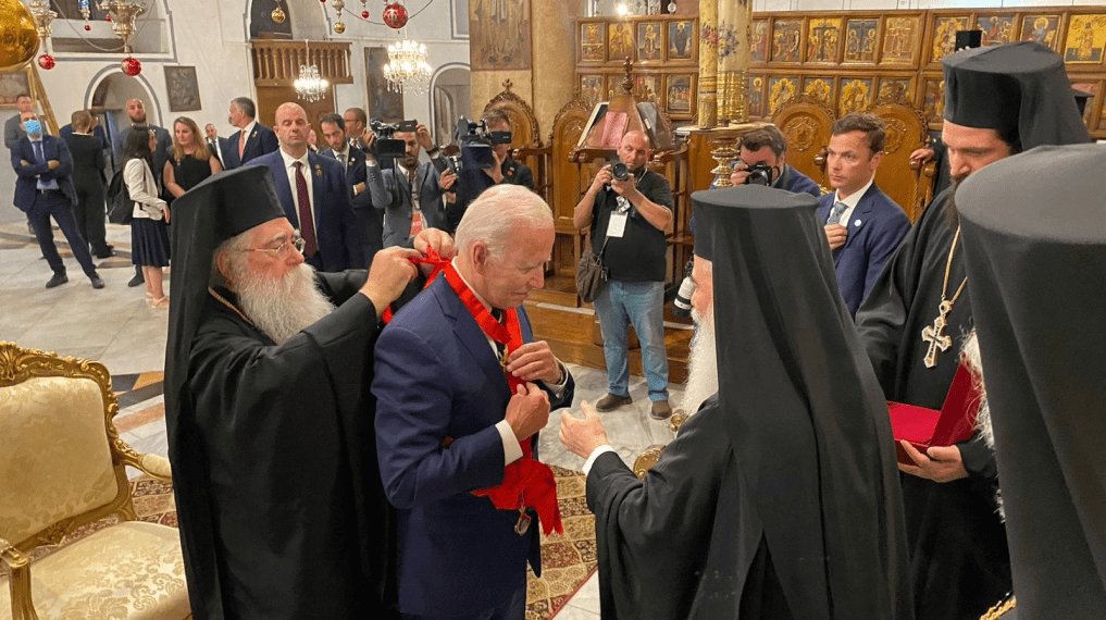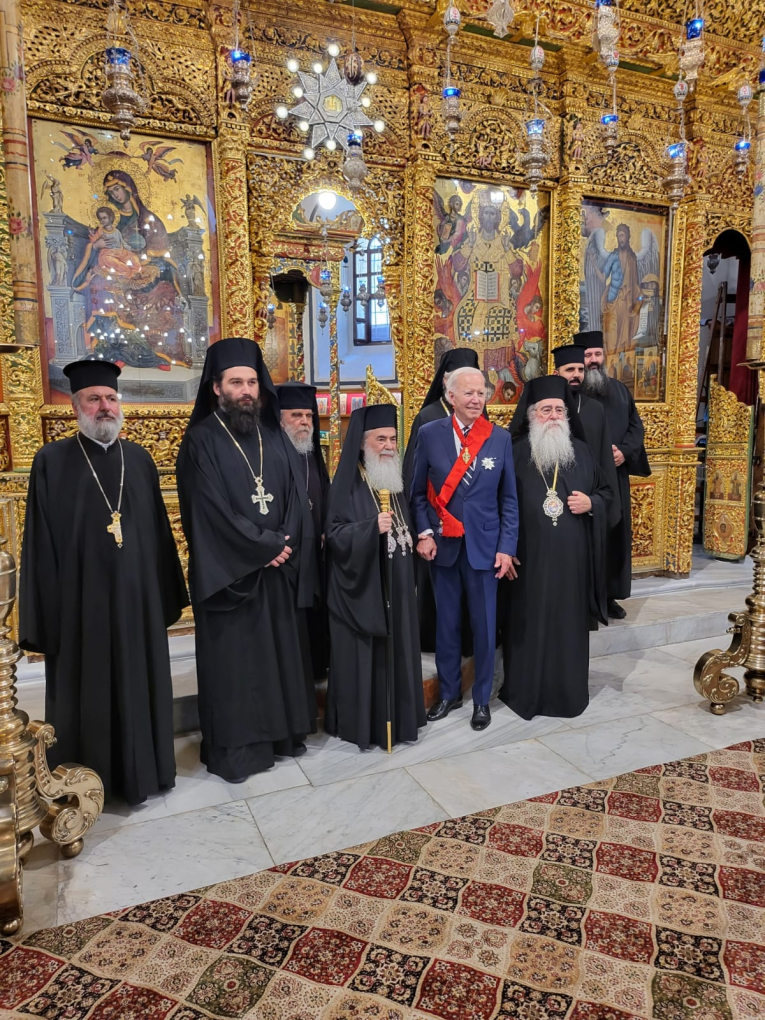 Εκπρόσωποι των τριών εκκλησιών που οδηγούν την Εκκλησία της Jerusalem, του Ελληνορθόδοξου Πατριαρχείου, του Βατικανού και των Αρμενίων, χαιρέτισαν τον Πρόεδρο των ΗΠΑ Τζόζεφ Μπάιντεν στην είσοδο της εκκλησίας στη Βηθλεέμ και τον χαιρέτισαν συνοδευόμενοι σε μια σύντομη επίσκεψη στον χώρο της Του Χριστού Γέννησης, όπου έγινε δεκτός από τον Πατριάρχη Θεόφιλο Γ’, Πατριάρχη Ιεροσολύμων και Πάντων των Έργων της Παλαιστίνης Ιορδανία,ς Θεματοφύλακα των Αγίων Τόπων πατέρα Πάτον, και τον Αρμένιο Ορθόδοξο Πατριάρχη Nurhan Manogyan, συνόδευσε τον Πρόεδρο των ΗΠΑ σε περιοδεία και συζήτησε μαζί του παρουσία ορισμένων Παλαιστινίων αξιωματούχων.