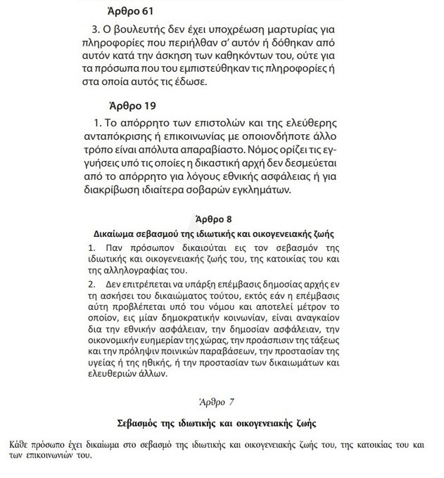 ‘‘Παράνομες οι υποκλοπες σε Ανδρουλάκη, λέει ο Ευάγγελος Βενιζέλος με βάση διατάξεις του Συντάγματος (άρθρα 61 και 19), της Ευρωπαϊκής Σύμβασης Δικαιωμάτων του Ανθρώπου (άρθρο 8) και του Χάρτη Θεμελιωδών Δικαιωμάτων της Ευρωπαϊκής Ένωσης (άρθρο 7).’‘