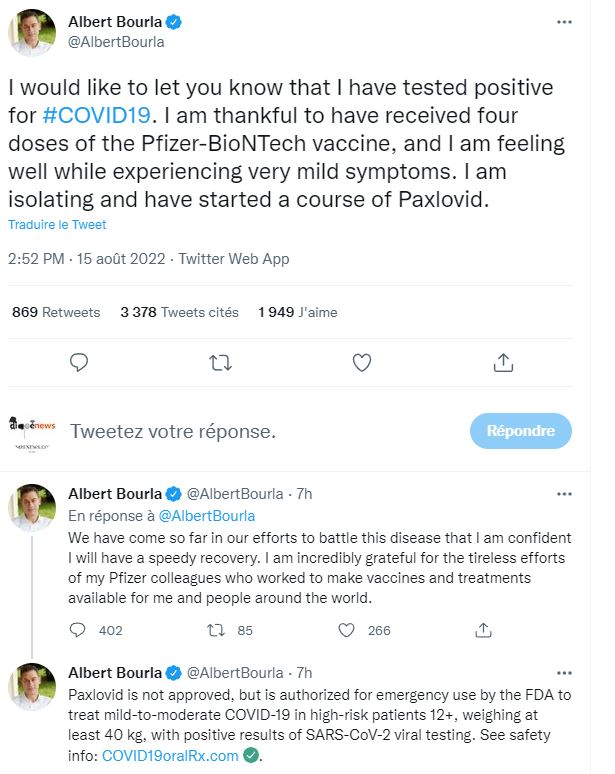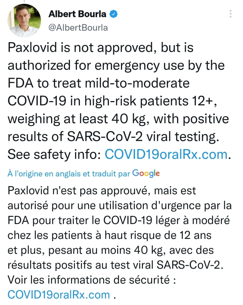 Έχουμε προχωρήσει τόσο πολύ στις προσπάθειές μας να καταπολεμήσουμε αυτήν την ασθένεια που είμαι βέβαιος ότι θα έχω μια γρήγορη ανάρρωση. Είμαι απίστευτα ευγνώμων για τις ακούραστες προσπάθειες των συναδέλφων μου στην Pfizer που εργάστηκαν για να καταστήσουν διαθέσιμα εμβόλια και θεραπείες για εμένα και τους ανθρώπους σε όλο τον κόσμο.””Το Paxlovid δεν είναι εγκεκριμένο αλλά είναι εξουσιοδοτημένο για μια έκτακτη χρήση από το FDA προς αντιμετώπιση ελαφριού ως μέτριου covid19 σε υψηλού κινδύνου ασθενείς από 12 άνω με βάρος τουλάχιστον 40 κιλά κι αποτελέσματα θετικά στο test ιού SARS-CoV-2.”