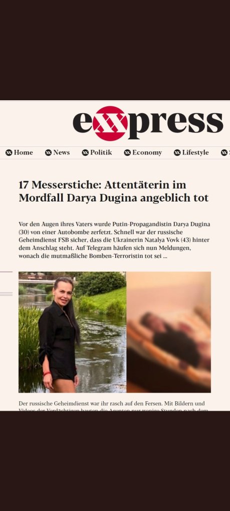 Νεκρή στην Αυστρία με 17 μαχαιριές η Ουκρανή τρομοκράτης που δολοφόνησε την κόρη του Ντάγκιν! Το αυστριακό μέσο Express ανέφερε το θάνατο της Νατάλια Βόβκ, την οποία η FSB θεωρεί την κύρια ύποπτη για τη δολοφονία της Ντάρια Ντούγκινα.Δεν υπάρχει επίσημη επιβεβαίωση. Ενώ από διάφορες πηγές στο διαδίκτυο αμφισβητείται η αυθεντικόητα της φωτογραφίας που τη δείχνει νεκρή.