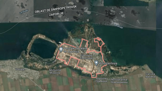 Το Energodar βρίσκεται σε κοντινή απόσταση από τον NPP Zaporozhye, περίπου 45 χιλιόμετρα έναντι του Δνείπερου από τις περιοχές Kamianske και Stepnogorsk.