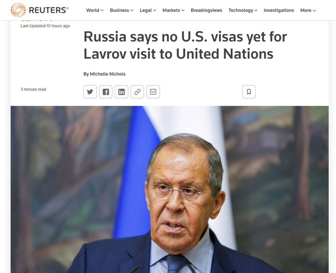 To (Reuters) αναφέρει ότι η Ρωσία ζήτησε 56 βίζες από τις Ηνωμένες Πολιτείες για να επιτραπεί στον Ρώσο υπουργό Εξωτερικών Σεργκέι Λαβρόφ και την αντιπροσωπεία του να ταξιδέψουν στη Νέα Υόρκη για την ετήσια συγκέντρωση των παγκόσμιων ηγετών στα Ηνωμένα Έθνη αυτόν τον μήνα, αλλά δεν έχουν λάβει καμία.