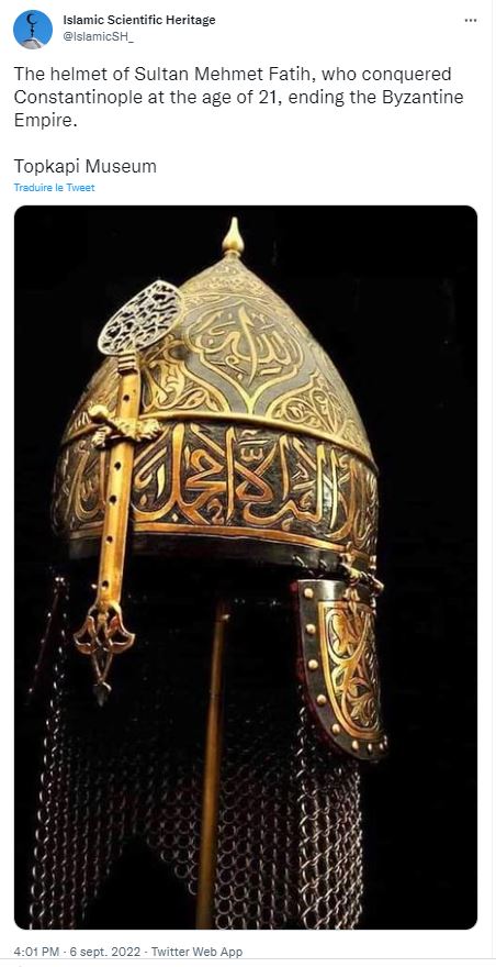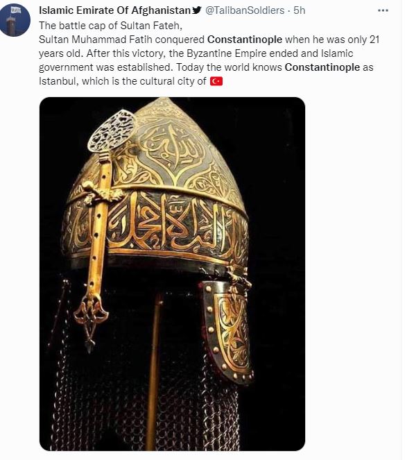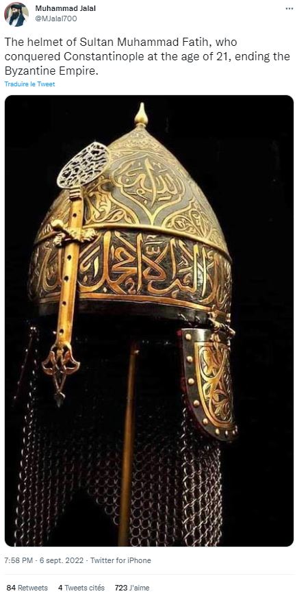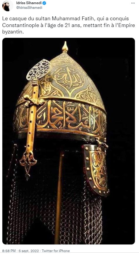 ”Το κράνος του σουλτάνου Μωάμεθ Φατίχ, που κατέλαβε την Κωνσταντινούπολη σε ηλικία 21 ετών, δίνοντας τέλος στη Βυζαντινή Αυτοκρατορία.” Eίναι η ανάρτηση του Sihamedi στις 6 Σεπτέμβρη ανήμερα Σεπτεμβριανών..Ο Sihamedi είναι ιδρυτής της ΜΚΟ ”BarakaCity” στη Γαλλία. Μια οργάνωση που το Υπ. Εσωτερικών τη θεωρεί εχθρό της Δημοκρατίας και είναι σε φάση διάλυσή της. Αντίστοιχη ανάρτηση από αυτοαποκαλούμενο ”Ισλαμικό Εμιράτο Αφγανιστάν-Ταλιμπάν Στρατιώτες”