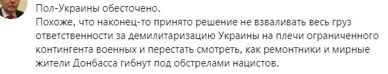 ”Η μισή Ουκρανία έχει black-out. Φαίνεται ότι τελικά ελήφθη μια απόφαση να μην τεθεί ολόκληρο το βάρος της ευθύνης για την αποστρατιωτικοποίηση της Ουκρανίας στους ώμους ενός περιορισμένου στρατιωτικού σώματος και να σταματήσoυμε να παρακολουθούμε τους πολίτες του Ντονμπάς να πεθαίνουν κάτω από τους ναζιστικούς βομβαρδισμούς.”