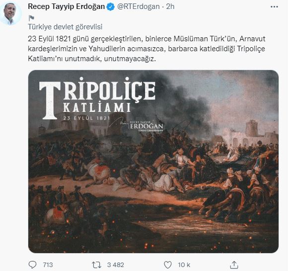 Ο ψευδο-Σουλτάνος απειλεί ως και την Απροσκύνητη Αγονάτιστη Τριπολιτσά… Ο Ερντογάν γράφει στο twitter πριν λίγο: ”Δεν ξεχάσαμε και δεν θα ξεχάσουμε τη Σφαγή της Τρίπολης, που έγινε στις 23 Σεπτεμβρίου 1821, κατά την οποία χιλιάδες μουσουλμάνοι Τούρκοι, Αλβανοί αδελφοί μας και Εβραίοι δολοφονήθηκαν βάναυσα και βάρβαρα.” παραλήρημα…
