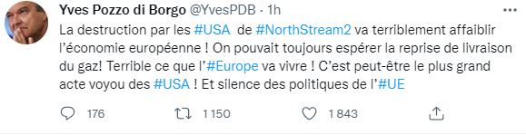 Είναι η σειρά του Γάλλου πολιτικού τ. Γερουσιαστή Yves Pozzo di Borgo ” H καταστροφή από ΗΠΑ του NorthStream 2 θ΄αποδυναμώσει φοβερά την ευρωπαϊκή οικονομία.Θα μπορούσαμε πάντα να ελπίζουμε στην επαναδιοχέτευση του αερίου. Φοβερό αυτό που θα ζήσει η Ευρώπη. Αυτή είναι ίσως η πιο μεγάλη κακοποιός πράξη ων ΗΠΑ. και σιωπή των πολιτικών της ΕΕ” .