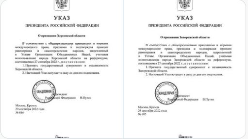Πράξη νο 1. Ο Πούτιν υπέγραψε διάταγμα αναγνώρισης Ανεξαρτησίας Ζαπορίζια, Χερσώνας! Τα αναγνωρίζει ως ανεξάρτητα κράτη. Για ν΄ακολουθήσει Παρασκευή η Πράξη νο 2 η προσάρτηση και των 4 αναγνωρισμένων από Ρωσία 4 Ανεξάρτητων περιοχών αφού Λούγκανσκ, Ντόνετσκ έχουν ήδη αναγνωριστεί. Πουλάει τρέλα ο Πούτιν στην τρέλα της Παγκόσμιας Εξουσία!