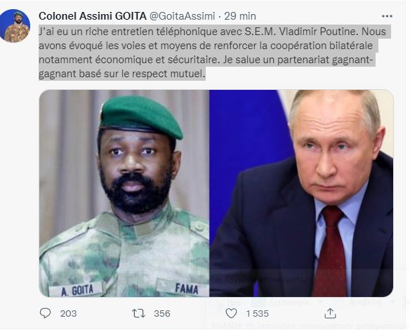 Ζ Αφρικής…….Φιλορωσικά καθεστώτα ξεφυτρώνουν στην Αφρική. Η Αφρική υποδέχεται τη Ρωσία. Μάλι, Μπουρκίνα Φάσο, Λιβύη του Χαφτάρ, Αλγερία. O νυν επικεφαλής του Μάλι που πριν λίγο καιρό πήρε την εξουσία με στρατιωτικό κίνημα στρατηγός Assimi Goita ανακοινώνει πριν λίγο ότι είχε τηλεφωνική επικοινωνία με τον Πούτιν.”Είχα μια πλούσια τηλεφωνική επικοινωνία με τον S.E.M. Vladimir Poutine. Αναφέραμε τους δρόμους και τα μέσα ενίσχυσης της διακρατικής συμφωνίας κυρίως οικονομικής κι ασφάλειας. Χαιρετίζω μια εταιρική νικηφόρα σχέση βασισμένη στον αμοιβαίο σεβασμό.”