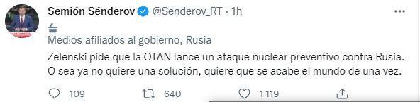 Δημοσιογράφος RT Semión Sénderov: Ο Ζελένσκι καλεί το ΝΑΤΟ να εξαπολύσει προληπτικό πυρηνικό χτύπημα κατά της Ρωσίας. Με άλλα λόγια, δεν θέλει πλέον λύση, θέλει άμεσα το Τέλος του Κόσμου!